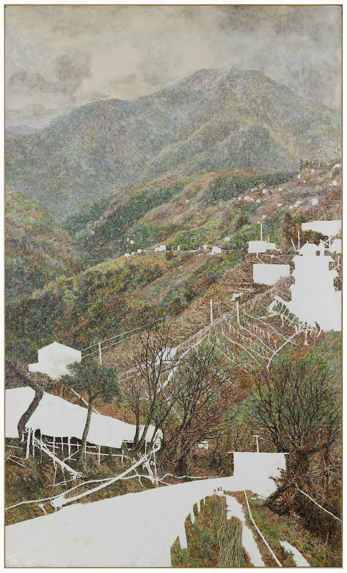 〈摺疊的風景〉子題中,作品從地質、山林到城市更新,呈現人與土地互相塑造的記憶。洪天宇《中橫三闕 1900、1960、2000》不同時期的山景油畫呈現百年環境變遷;伊琳娜.波提亞.布坎(Irina Botea Bucan)與喬恩.迪恩(Jon Dean)使用刺繡與裝置呈現《未完成的文化中心》,提出「文化永遠在生成」的命題。